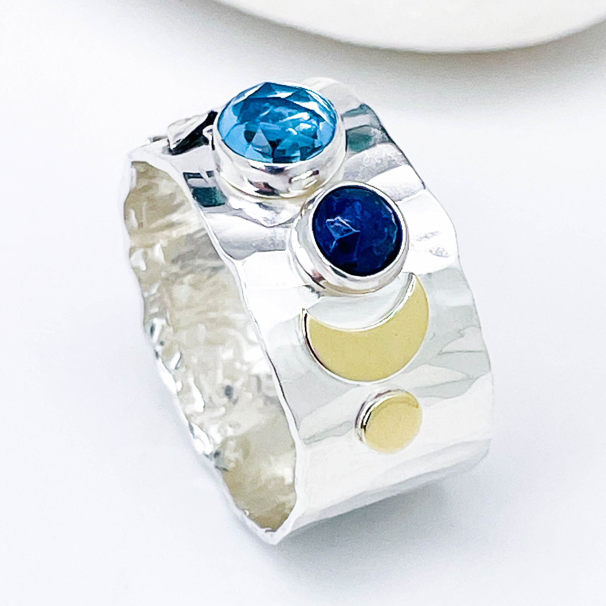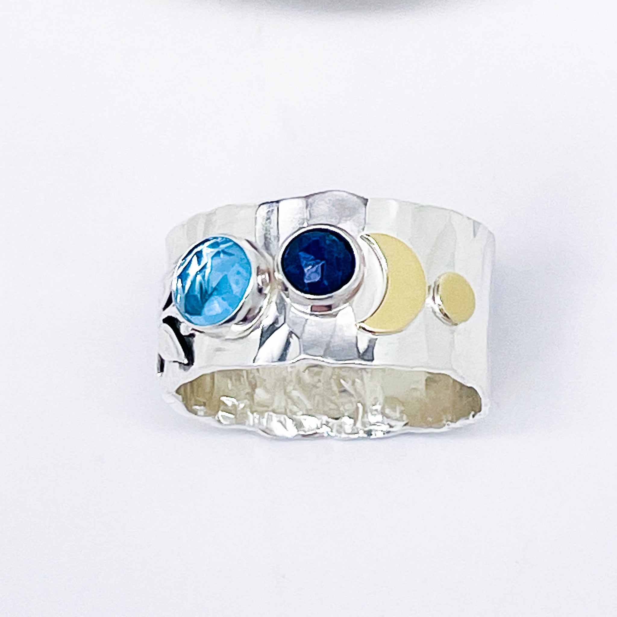 Sterling Silver Celestial Branch Wide Band Ring Particulars: Band size is 9. Set with Blue Topaz, Sapphire, and Gold Bi-metal crescent moons. 🌙