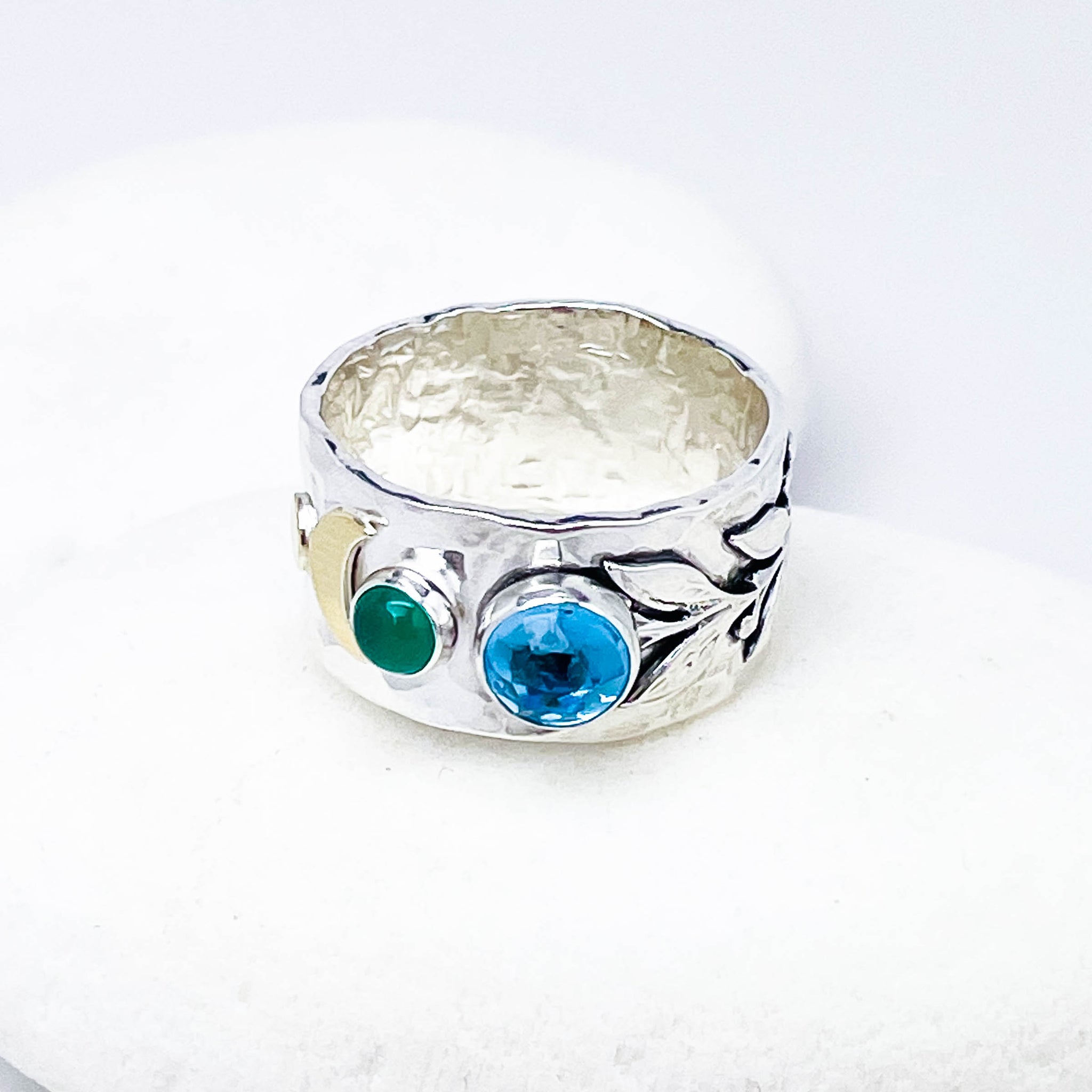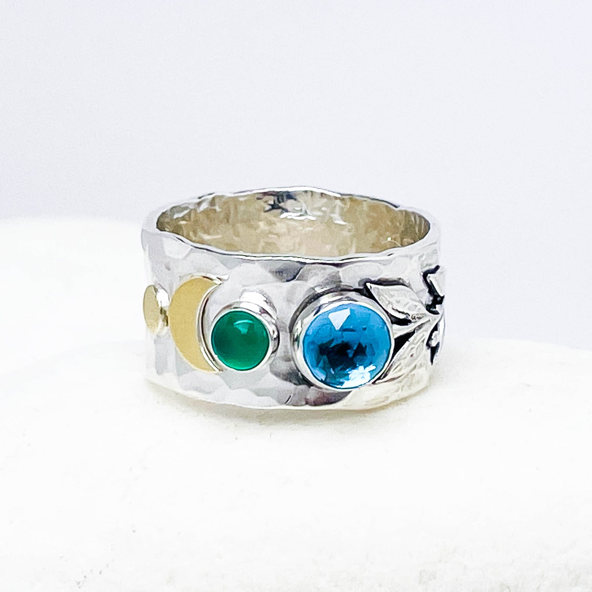 Sterling Silver Celestial Branch Wide Band Ring Particulars: Band size is 8. Set with Blue Topaz, Green Onyx and Gold Bi-metal crescent moon 🌙