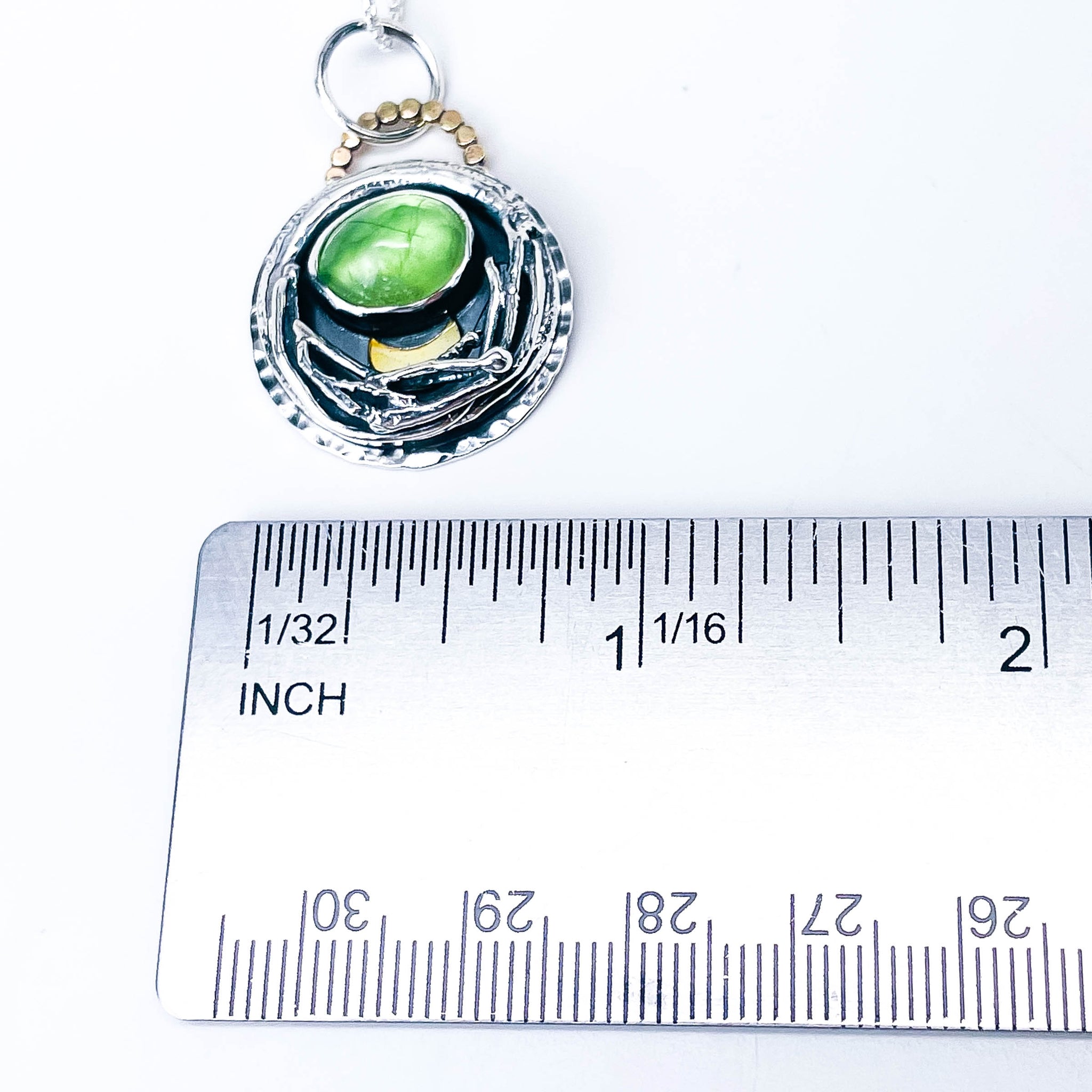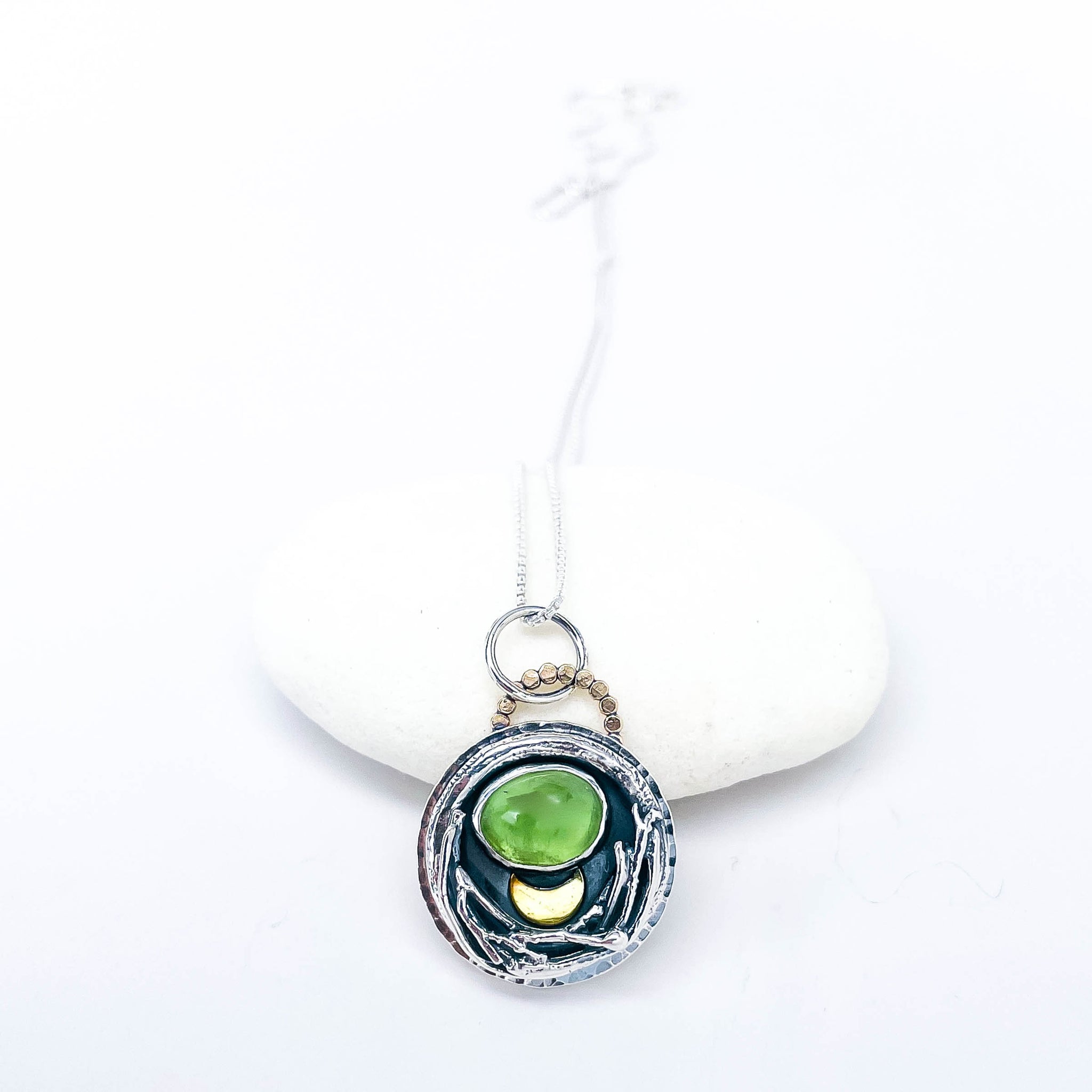 This pendant captures the essence of peridot—a stone revered since ancient times as the “gem of the sun” for its radiant green glow. Its vibrant hue symbolizes renewal, growth, and the calming energy of nature. Worn close to the heart, it serves as a gentle reminder to embrace change and find peace in the present moment.