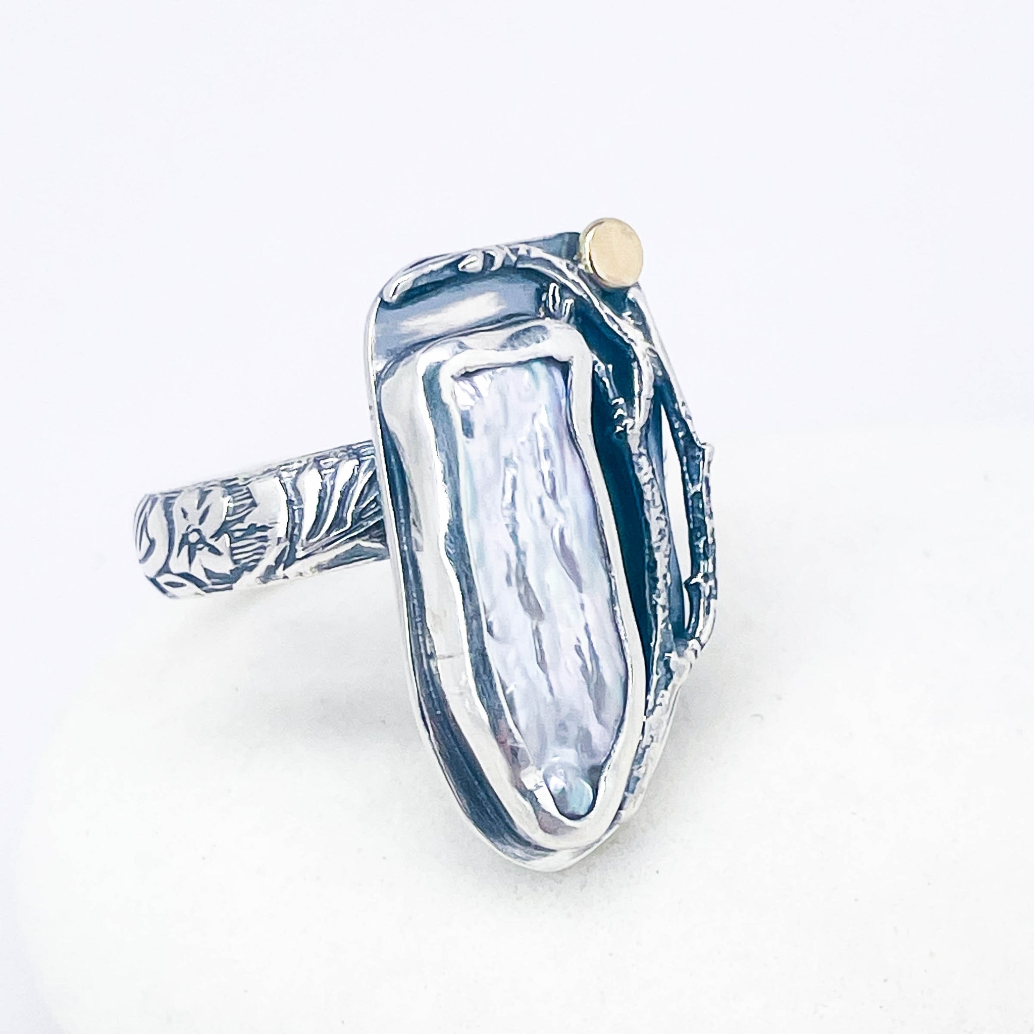 Ring particulars: Biwa pearl set within patinaed sterling silver with a floral band and 18k gold dot.