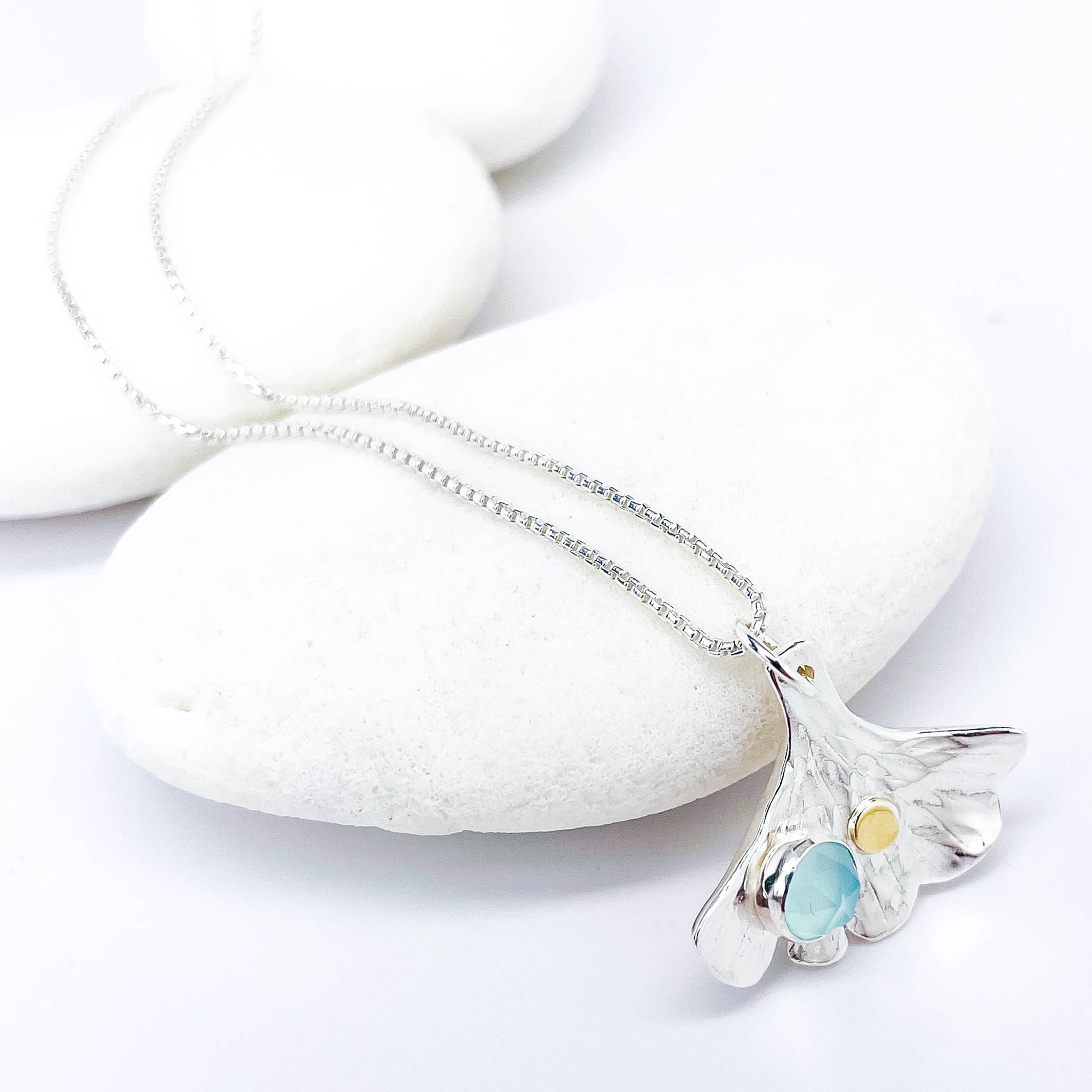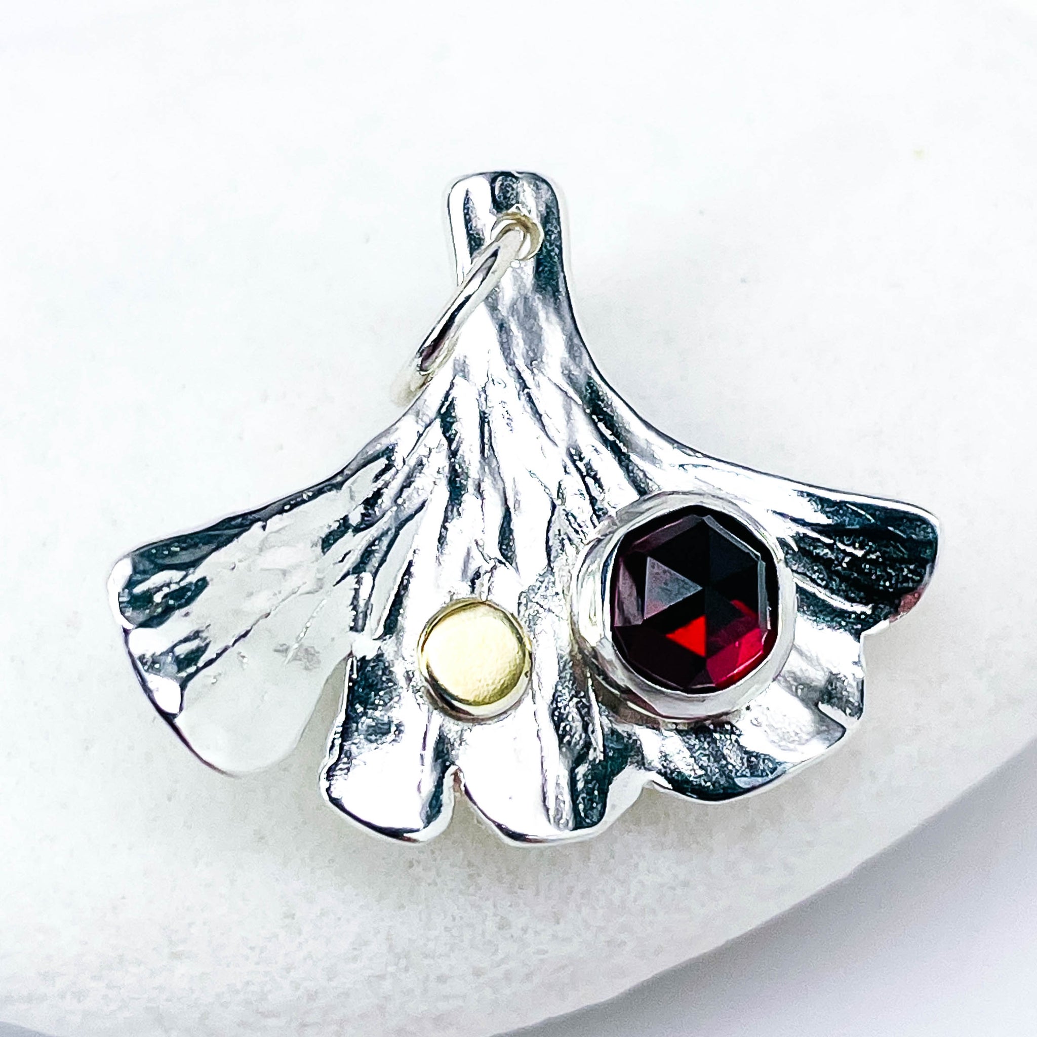 Handmade and sculpted out of sterling silver from Ginkgo leaves from my own backyard. These necklaces embody the strength and fortitude of the tree from which they originate. Elegant and breathtaking, the ginkgo pendants are a marvel. An individual stone is set onto each sterling leaf.