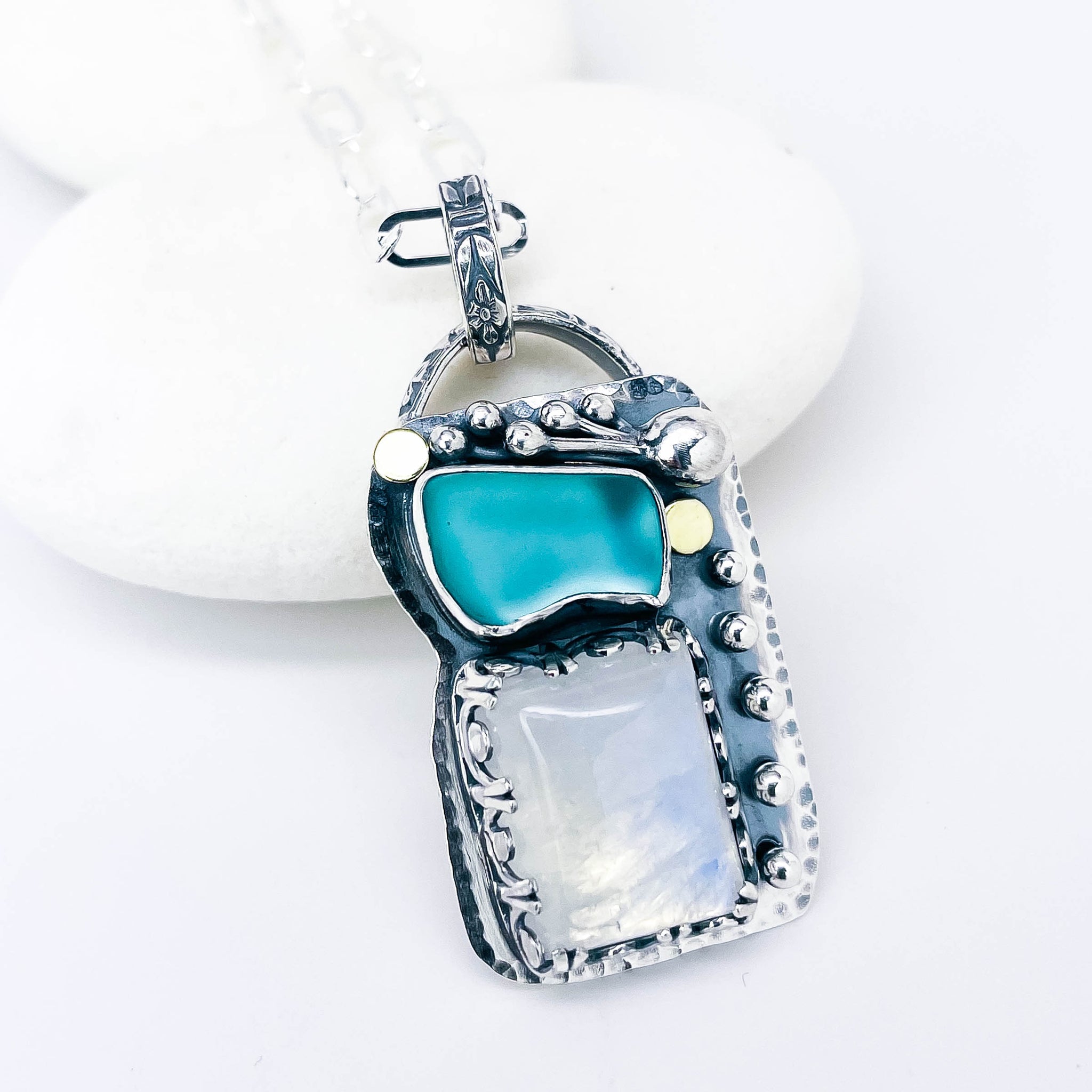 Softly worn by time and tide, this piece brings together two treasures shaped by nature — a smooth piece of sea glass and a moonstone, each with its own quiet story.