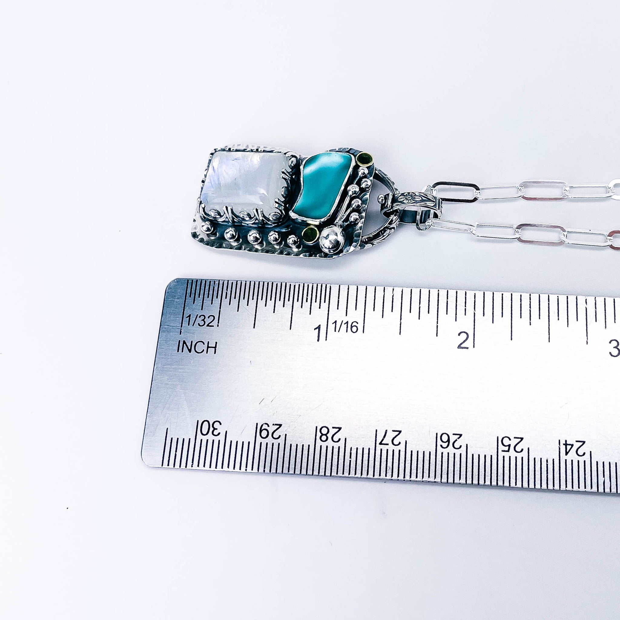 Set with Maui, Hawaii Sea Glass Moonstone and oxidized sterling silver. Comes with 18" paper clip chain or without.