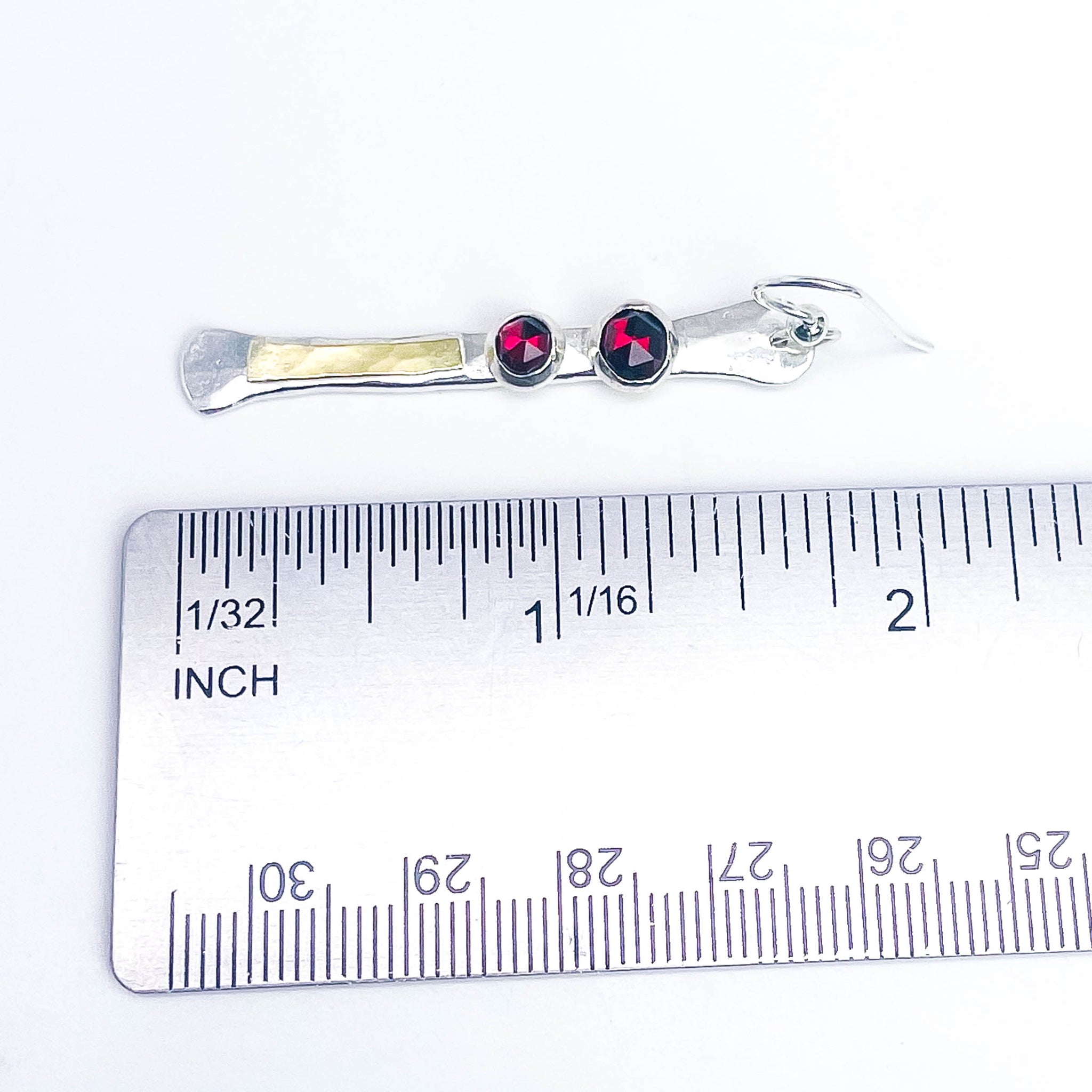 Particulars: Handcrafted wabi sabi style sterling totem earrings, handcrafted with Hessonite Garnet and Garnet stones, 18K Gold.