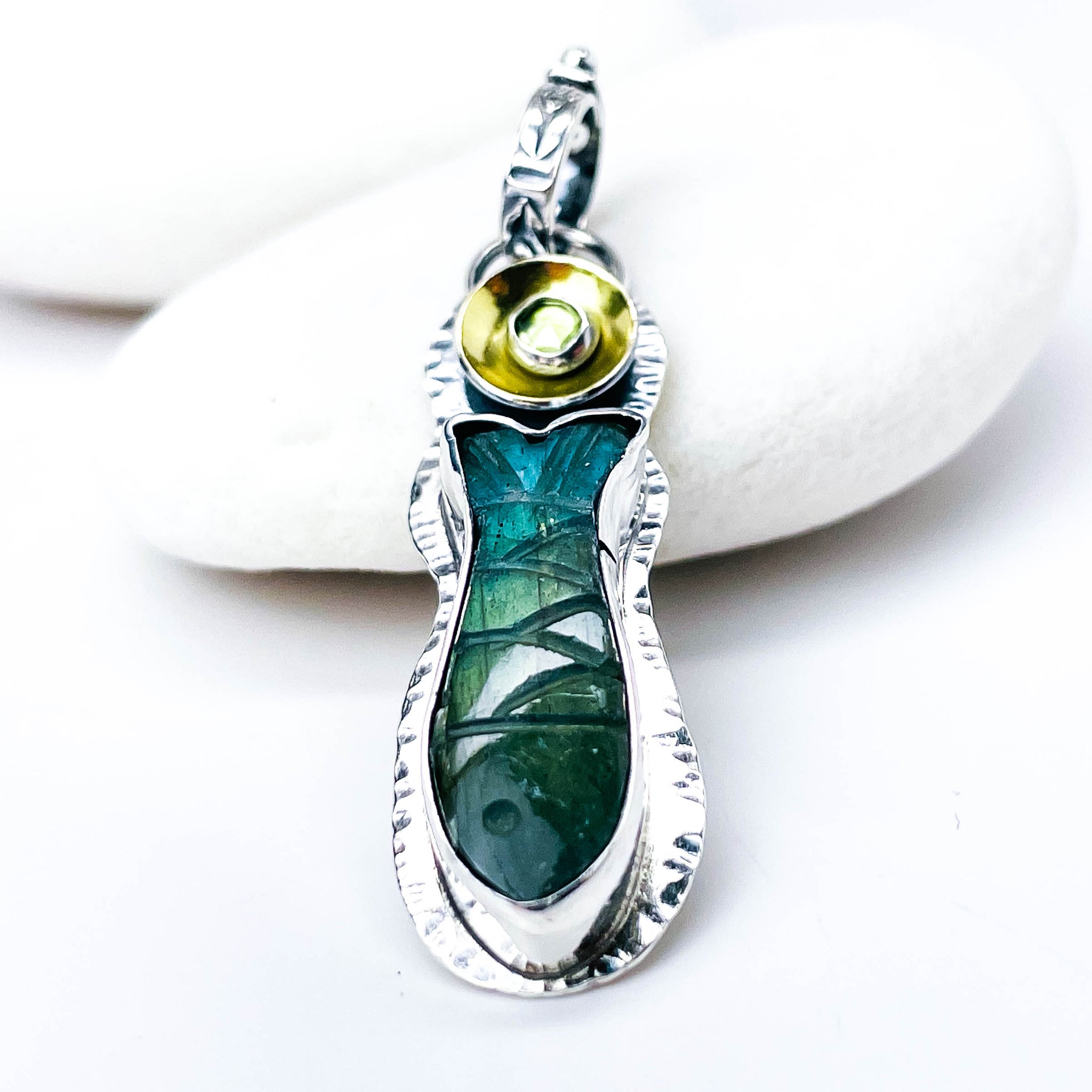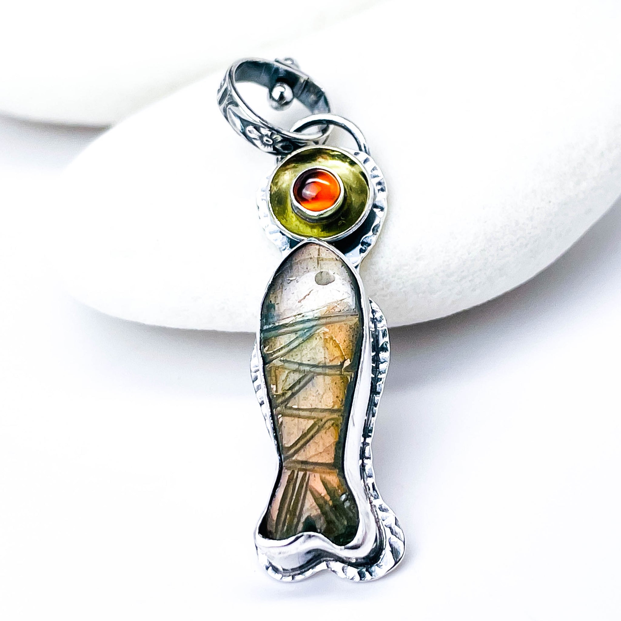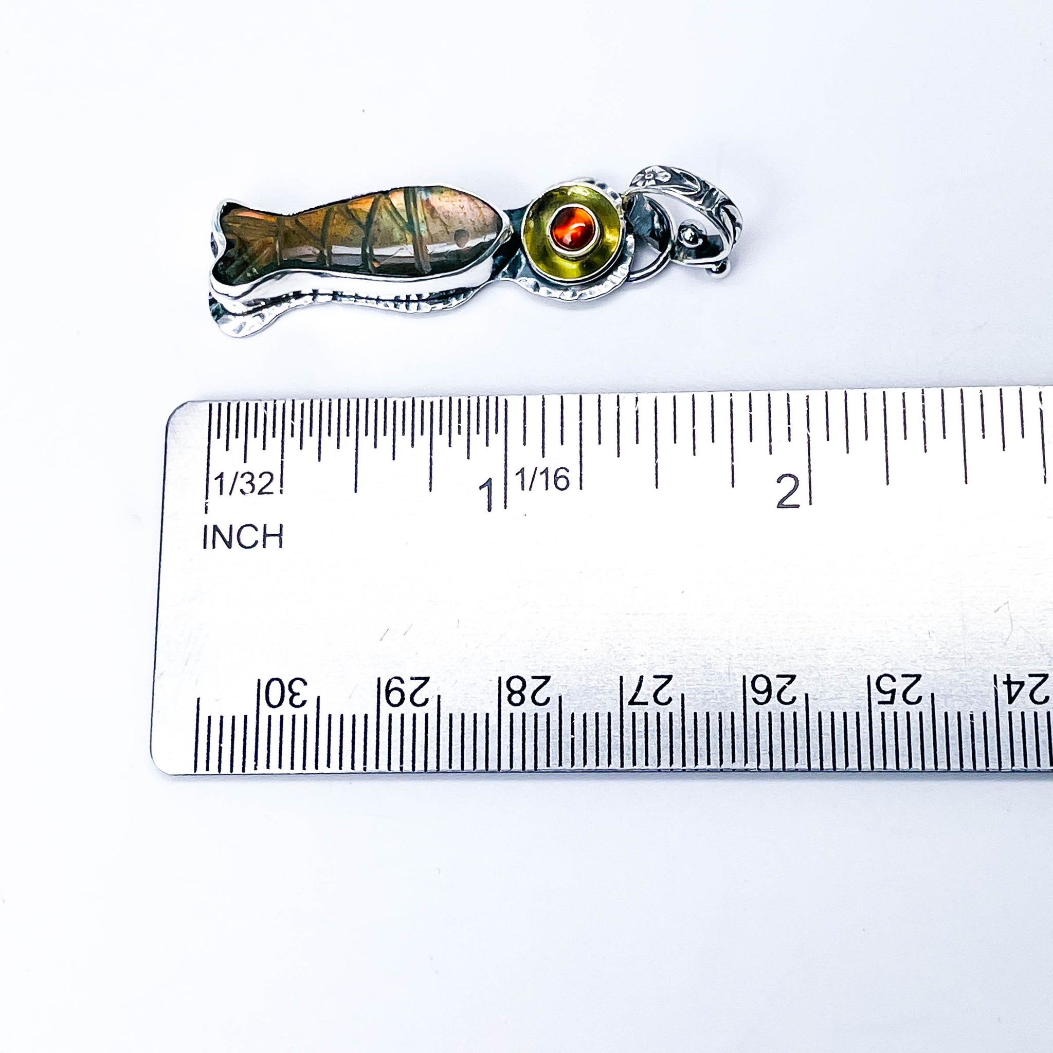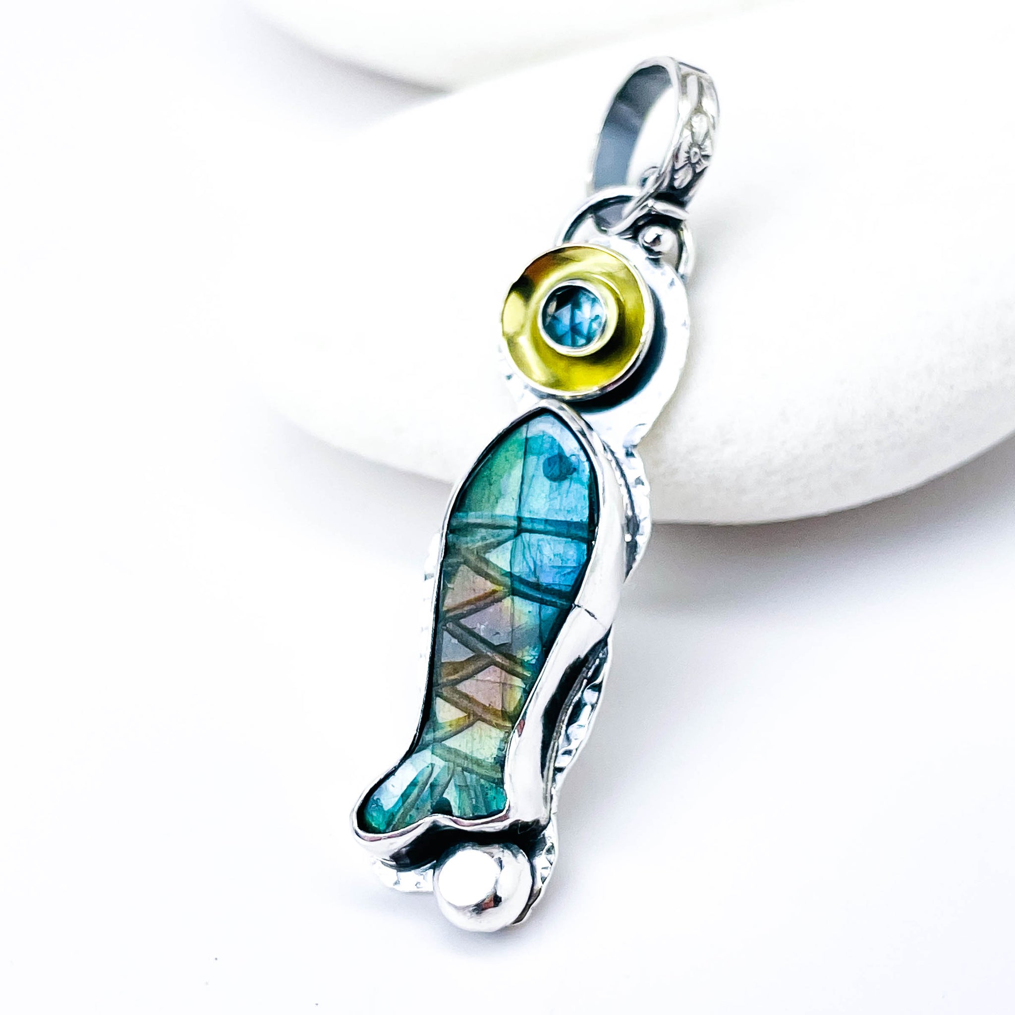 Each stone carries that depth: a flash of teal, a wash of slate, a flicker of flame. Held in silver, shaped like fish swimming in pairs or joyfully twisting currents, they become more than jewelry—they become poetry in motion.
